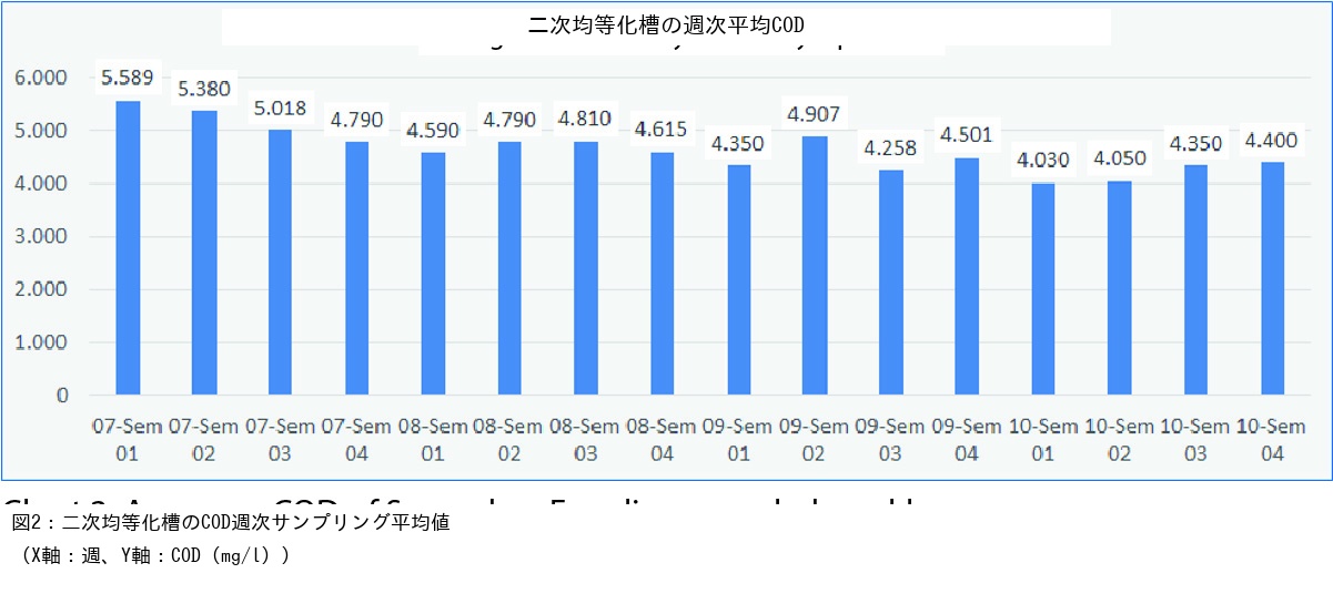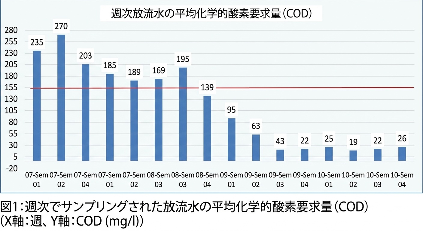 最も重要な事は、最終処理水の水質が大幅に改善されたことです。CODは約200から20-30まで低下しました。