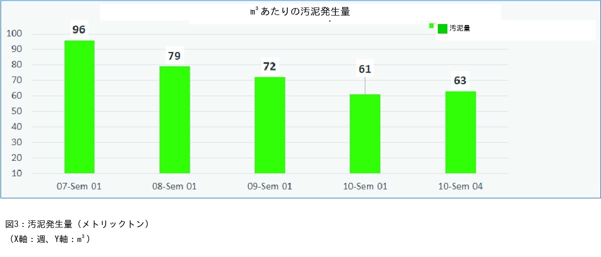 また、汚泥の量が大幅に削減されたことも確認されており、30~40%の削減が見られました。これにより、廃棄物最終処理コストも削減されました。