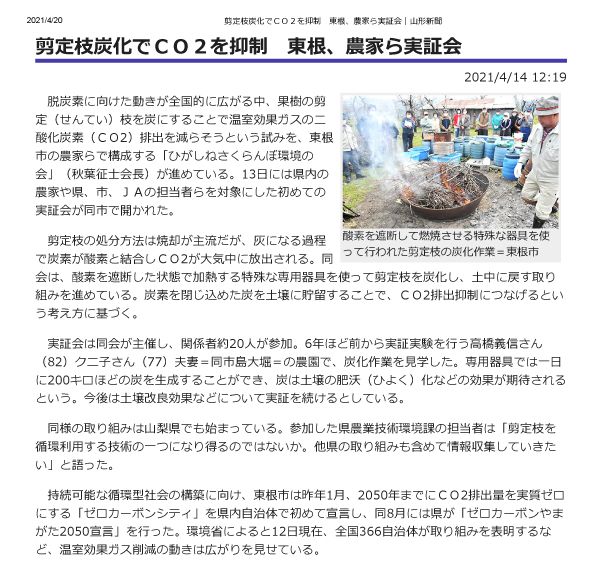 無煙炭化器を使ってEM木炭を作り、CO2排出量を削減する取り組みが、山形新聞に掲載されました。
