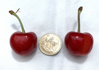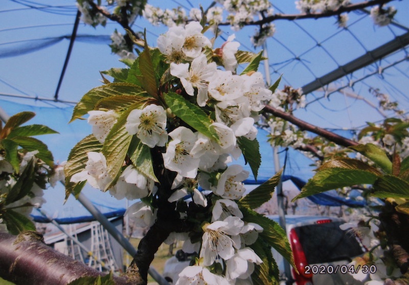 「佐藤錦」はもともと実が小さい品種ですが、20年以上にわたるEMの活用とEM木炭の使用により、このように大きな花を咲かせました。そして、さくらんぼを見てください!宝石のように輝いています。