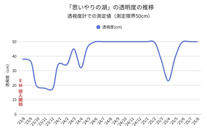 ※透視度計の計測限界が50cmですので50cmと表記していますが、実際にはさらに深くまで目視できるほど透明度が向上しています。