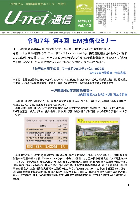 地球環境共生ネットワークより、U-net通信第142号がリリースされました。