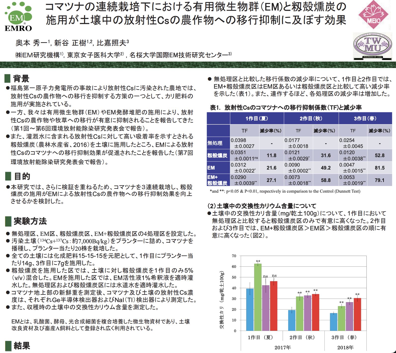 EFFECT OF RICE HUSK-DERIVED BIOCHAR AND EFFECTIVE MICROORGANISMS (EM・1®) ON THE SUPPRESSION OF RADIOACTIVE CESIUM TRANSFER FROM SOIL TO AGRICULTURAL CROPS UNDER THE CONTINUOUS CROPPING OF KOMATSUNA (Brassica rapa var. perviridis)